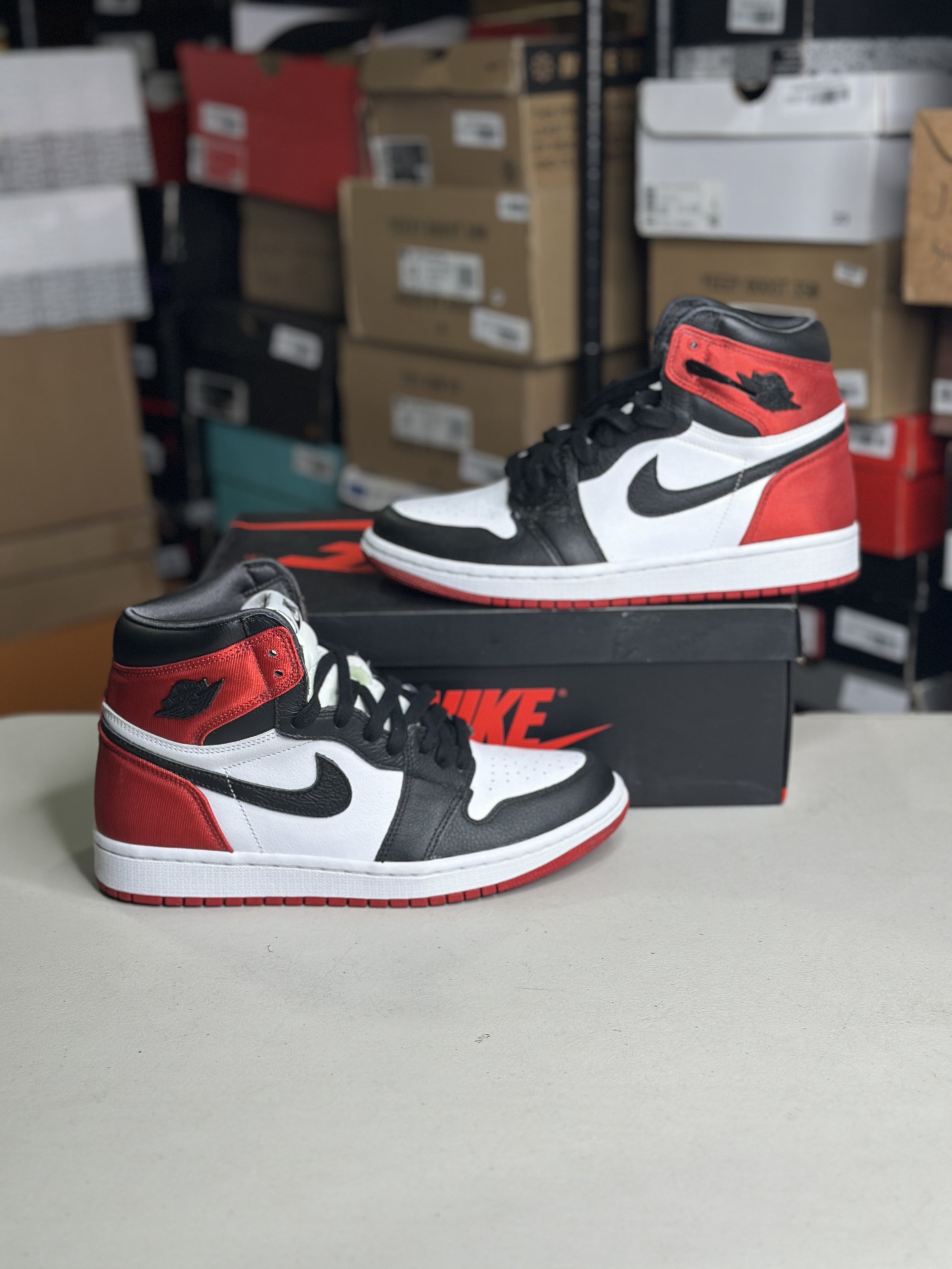 Shop By Size › Jordan 1 Satin Black Toe (Size 7) Image 1 of 1 Jordan 1 Satin Black Toe (Size 7) $69.99 SOLD OUT Worn (with box) 8.5w/7y SOLD OUT Added! Worn (with box) 8.5w/7y